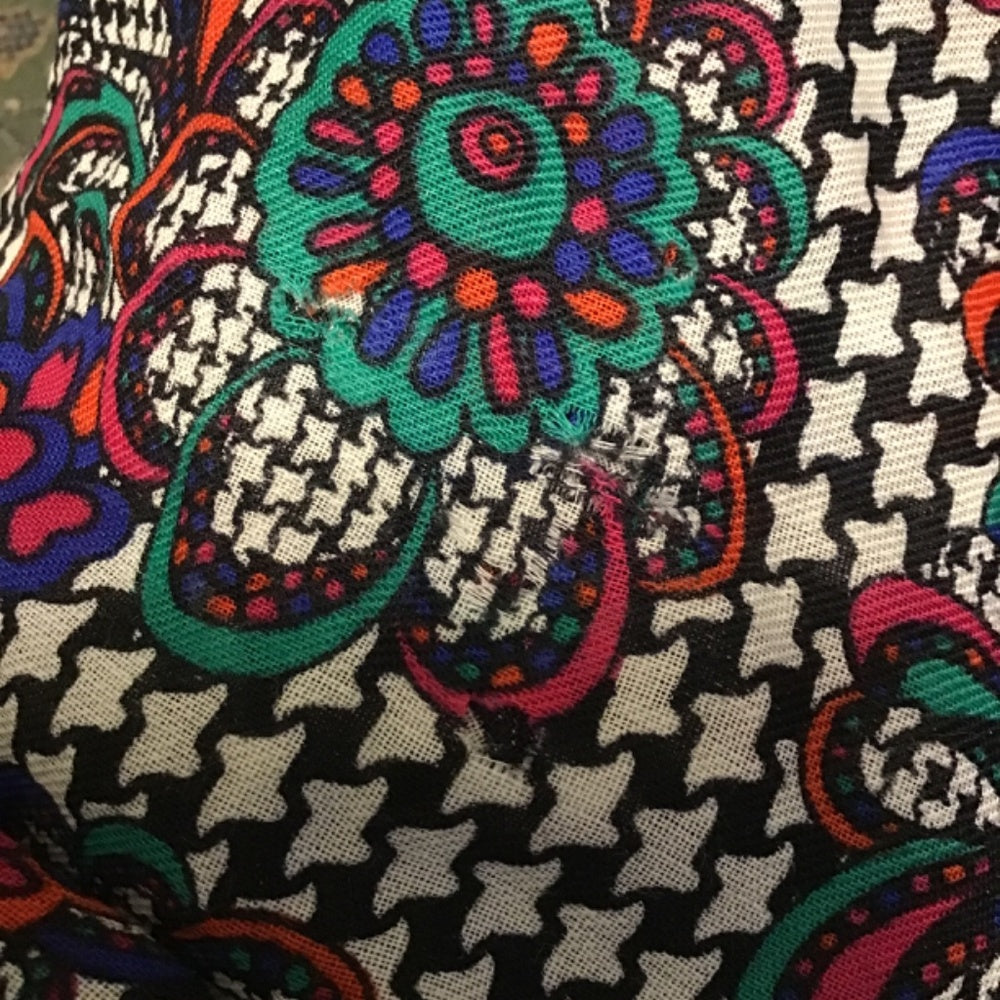 Made in Italy Geoffrey Beene New York 100% wool scarf multicolor the main color is black with really cool patterns, has 3 small holes not even noticeable shown on the pictures, the size of the scarf is: