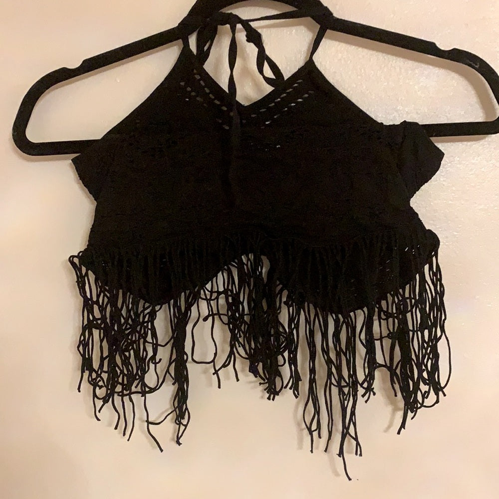 🎀Free People black flirty tassel halter crop top perfect for summer🦋 extra stretchy.great for festivals the front is shorter than back
