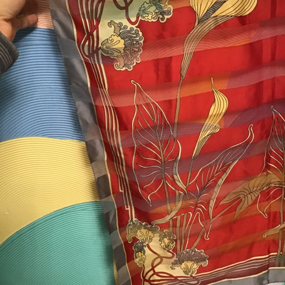 This soft amazing scarf is made in Italy 100% polyester dry clean only color red gray and tan, with a very cool pattern. The size of this scarf is: