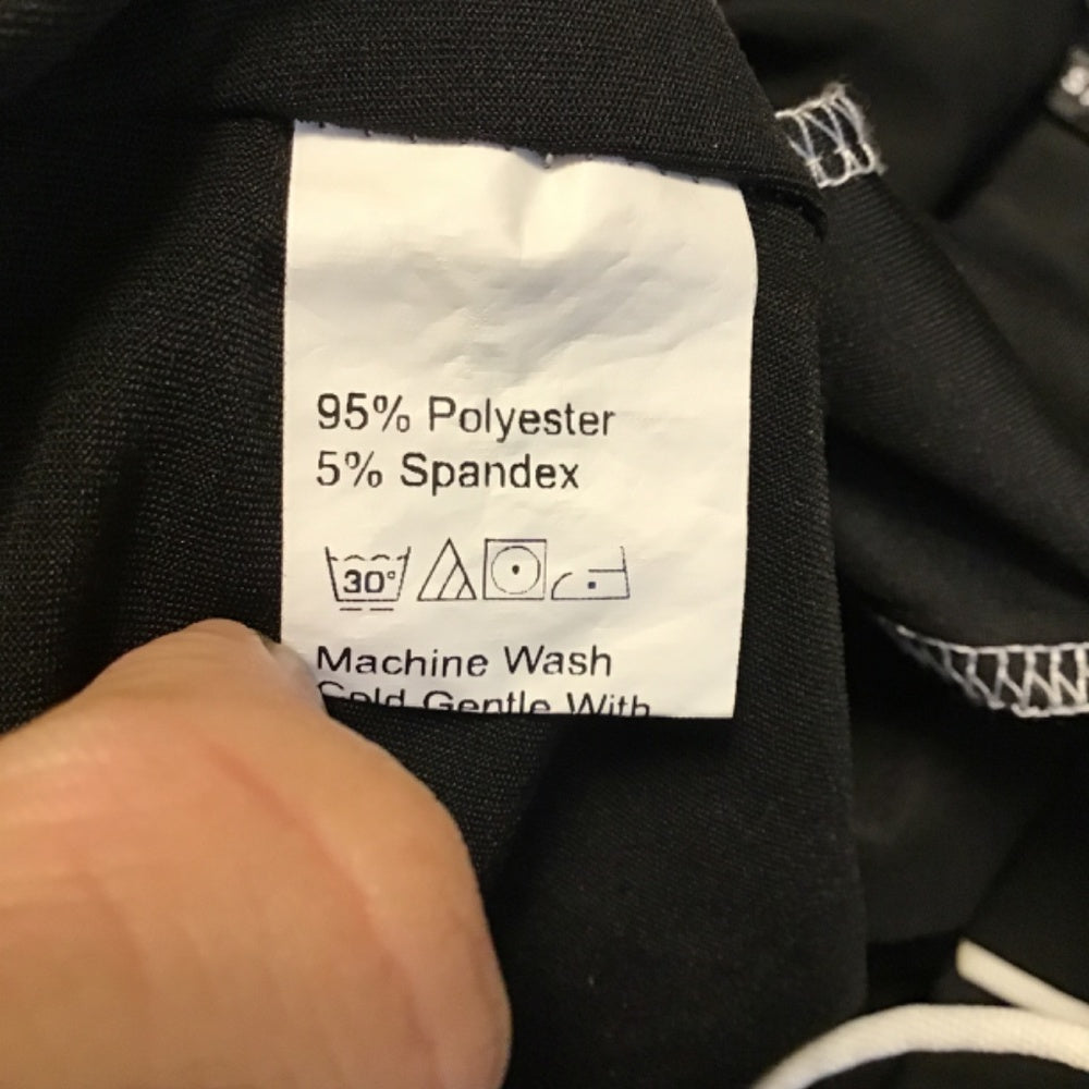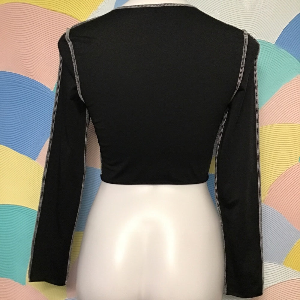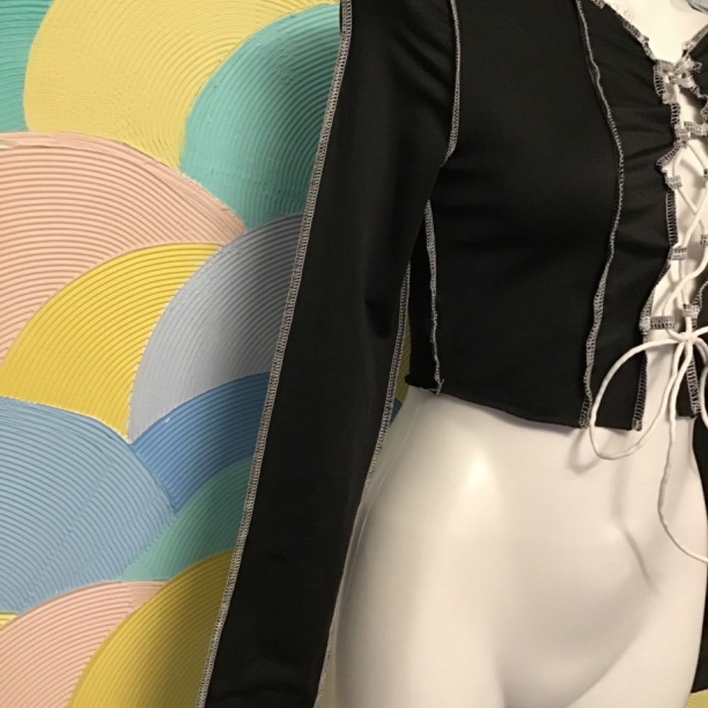 Shein long sleeve shirt with tie in front very stretchy it’s black with white sowing 95 % polyester 5 % spandex some of the sowing on top is off.