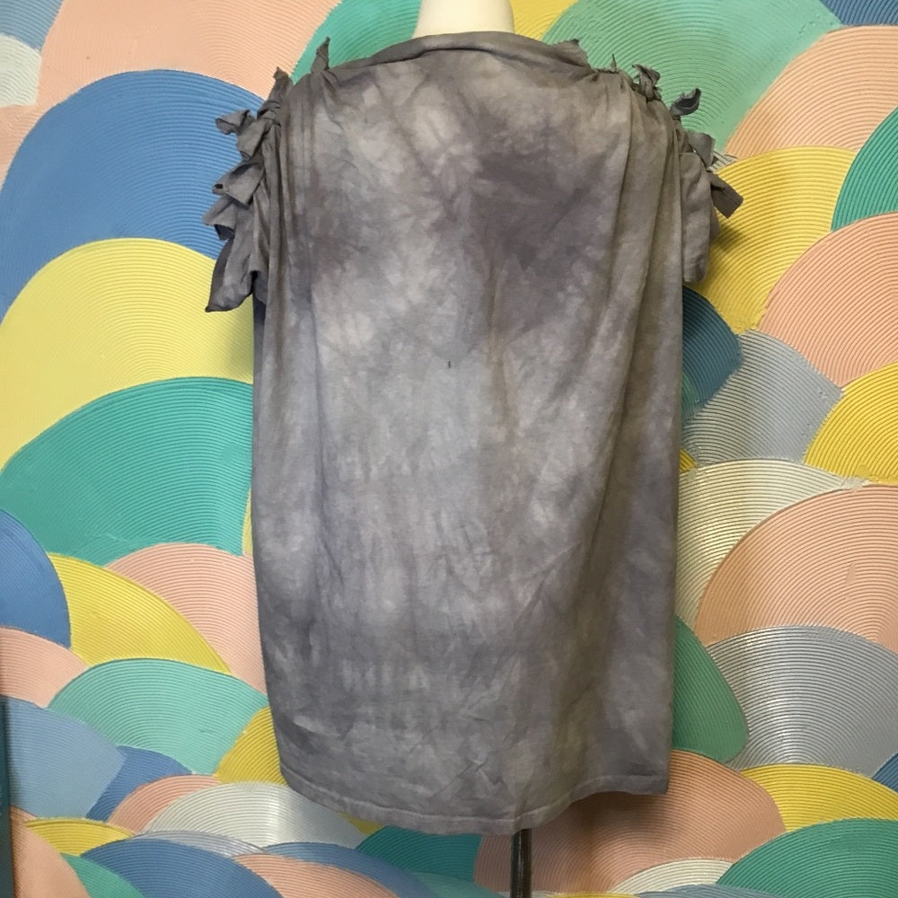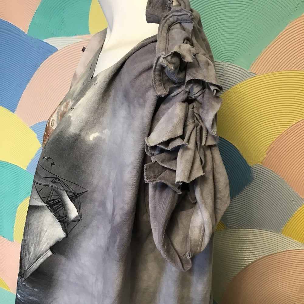 If you like cats, this is the perfect top for you. Beautiful artwork of a cat at sea with vibrant colors and great detail. Shoulders and arms are hand cut and tied for a unique look. Small hole on the back.