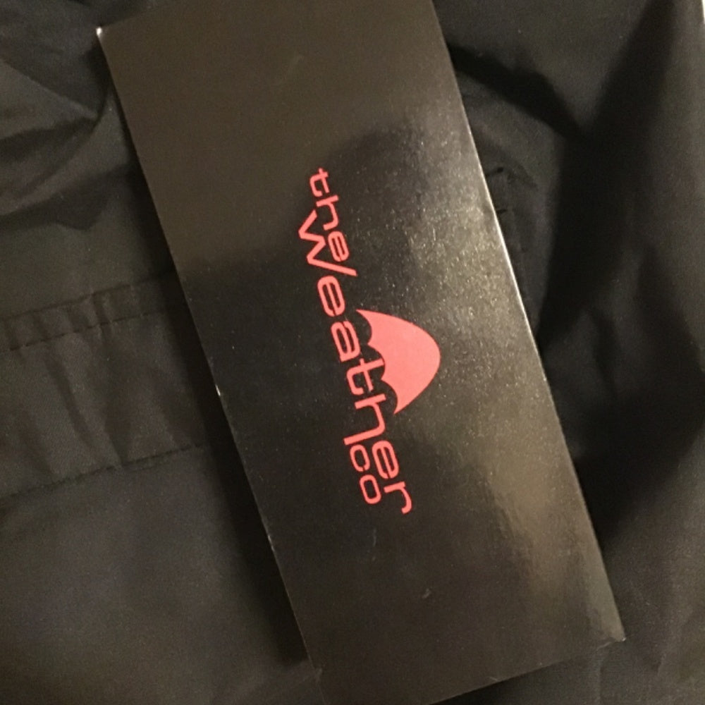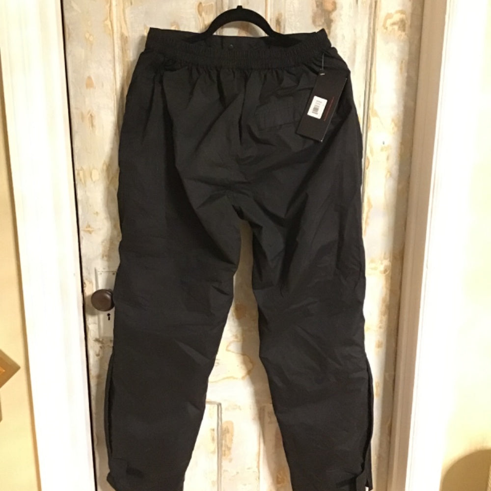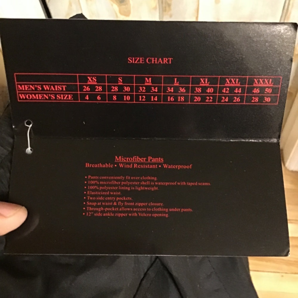 The weather co water proof black medium men pants 2 front pockets with zippers back pocket with zipper and has extra zippers on the bottoms see more details in pictures.