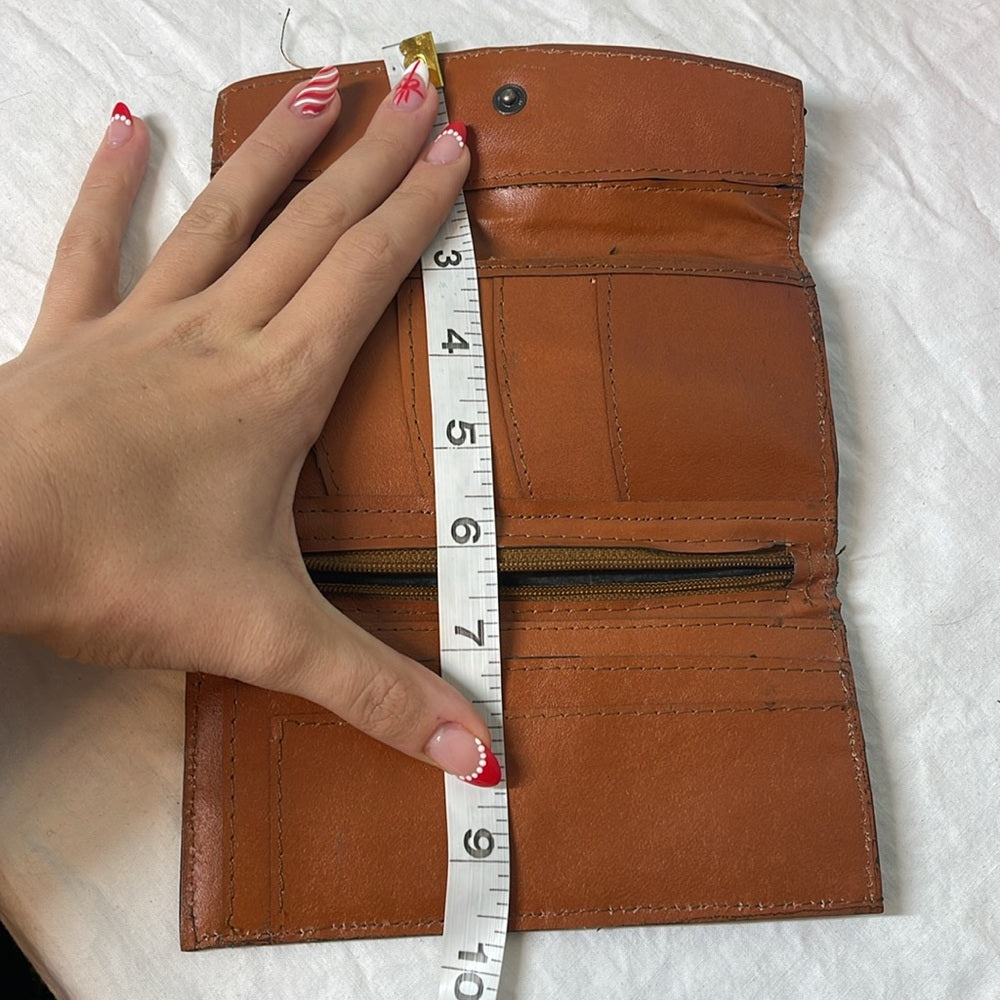 This vintage wallet, features multiple patterns of alligator suede and snakeskin. It features on the front of it a flower with leaves on a gold embellishment. The wallet snaps together and inside there is multiple compartments for credit cards, cash, and a zipper for change. The pictures have the measurements of the wallet.